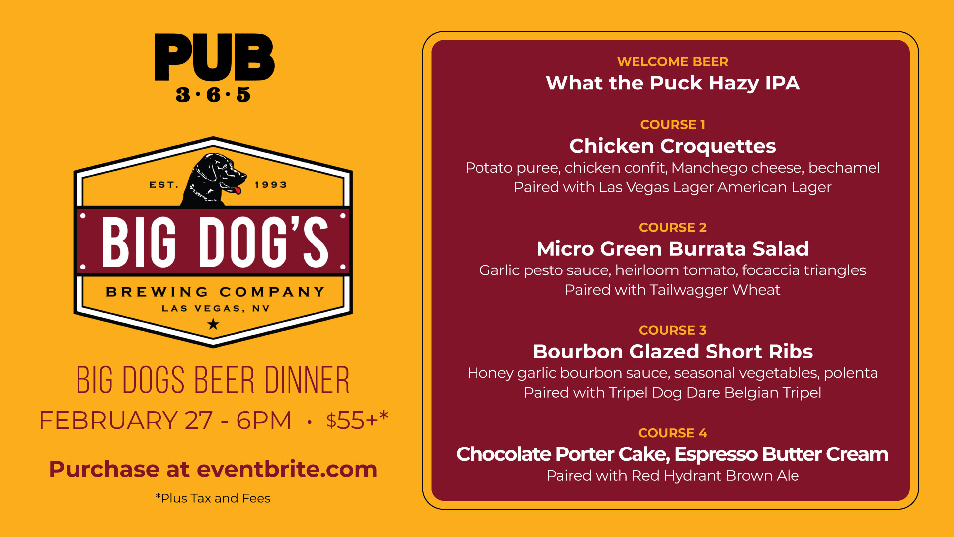 Come join us for a night of delicious food and amazing beer! Get ready to indulge in a mouth-watering menu paired perfectly with Big Dog's Brewing Company's finest brews. Don't miss out on this unforgettable culinary experience!